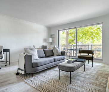 Welcome to a modern apartment surrounded by lush greenery...
